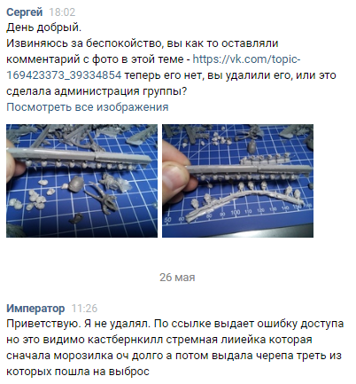 Продолжается эпопея с пузырями вместо миниатюр и отговорками про болезни, литейка на плаву, всем вышлем. Асмус нервно курит в сторонке.... Константин Хоцкий 8 окт 2019 в 18:59- Интересный подход у этой литейки, как начинают косячить со сроками включается игнор, на ваши сообщения отвечать не обязательно, да что там отвечать, их читать даже не будут... очень странное поведение по отношению к лояльным клиентам Тамерлан Абикенов 29 окт 2019 в 15:29 - Уже около месяца от продавца ни слова, сообщения игнорятся. Может хотя бы пост какой выложите, чтобы народ успокоить или ситуацию объяснить? Евгений Исаев 19 дек 2019 в 19:09- Знаете, не иначе как Пиз...ец, эту драму в 3-х действиях не назовешь. Сделал предзаказ на хавоков 21 Июня(!), получил на этой неделе. Товар ушел в работу 11 сентября, в тот же месяц оплатил... И всё, литейщик пропал и связи нету. Стучался в личку - без ответа. В октябре решил написать админу группы. Сказал что человек попал в больницу и сейчас не в состоянии отправить. Ладно, поверил. Дальше еще месяц тишины вплоть до начала декабря. 9 декабря сказали что могут отправить, в итоге отправили 16 декабря. ПОЛГОДА ждал заказ, и в итоге пришло дерьмо. Гора облоя, микропузыри в деталях и один который уничтожил ступню детальке, сдвиги и не долитые области. Такое ощущение что они ушли в работу не 11 сентября, а 15 декабря когда литейщика пнули под зад и он на отъебись отлил. Итог: Ну не описать словами мое недовольство, а ведь смотрел работы в альбомах, минимум облоя все хорошо. Заказывайте на свой страх и риск, а если учуяли неладное, сразу просите возврат средств. PS: Зачем кидать деньги бракоделам, " на свой страх и риск ", если есть адекватные мастера и литейки???