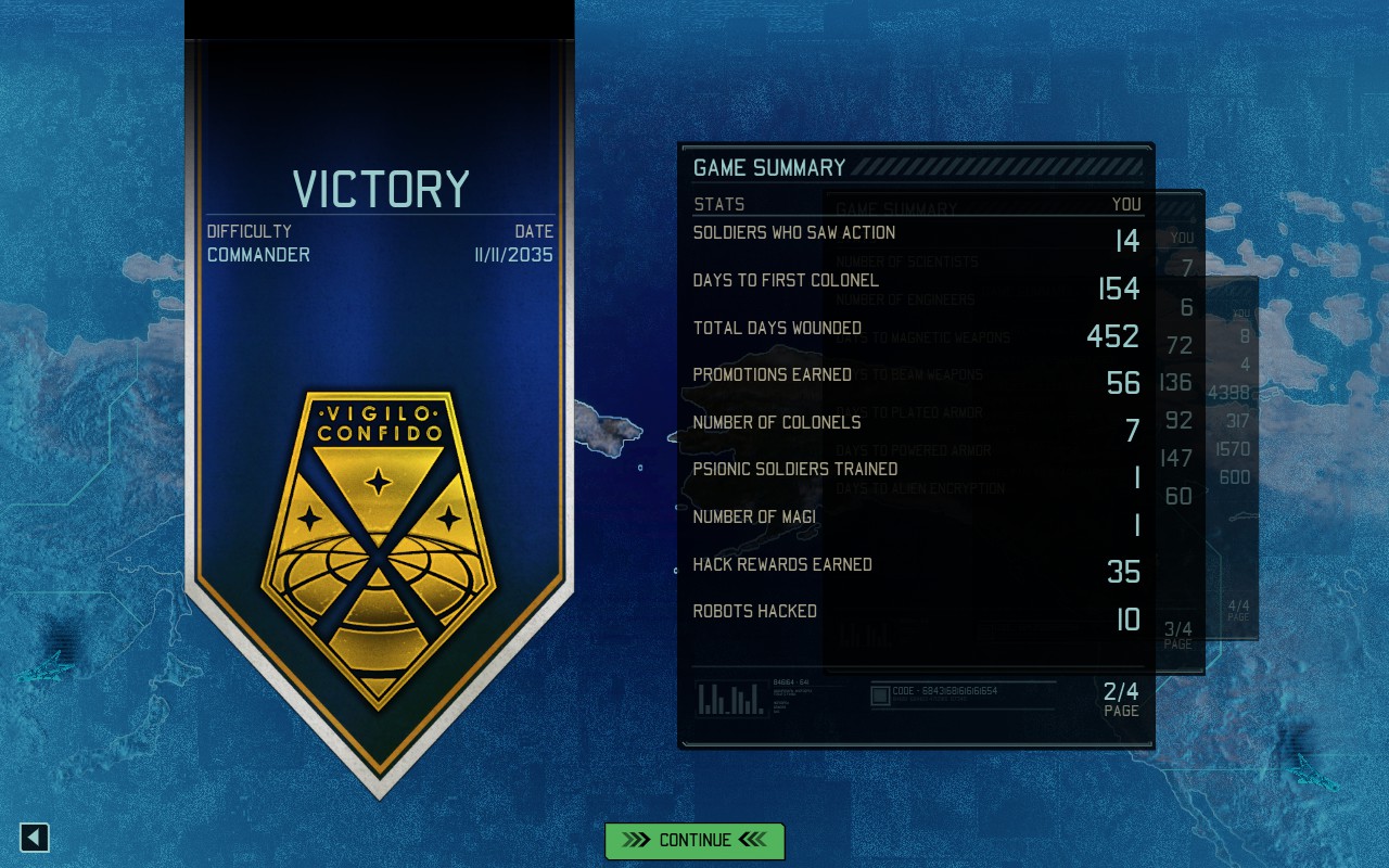 Sir Lawrence Gentleshark Опубликовано 7 февраля, 2016 Жалоба Поделиться Опубликовано 7 февраля, 2016 (изменено) Насчет лечения - строй лазарет сразу же и не вытаскивай оттуда инженера или гремлина, и если отряд у тебя не приходит смертельно раненый, должно выйти к тому, что будешь брать на задания более-менее стабильный состав. Апд. Посмотрел ещё раз статистику за кампанию. Гауссы взял на 72 дне, броню улучшил на 92 день, плазма получилась к 136, ПА на 147 день. "Неинтересные скриншоты со статистикой" Солдаты Задания Наука Ресурсы Изменено 7 февраля, 2016 пользователем Sir Lawrence Gentleshark Ссылка на комментарий Поделиться на другие сайты Поделиться