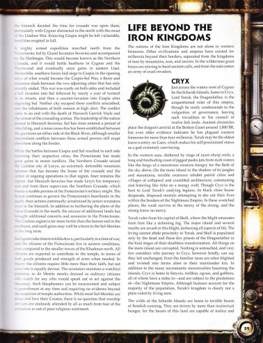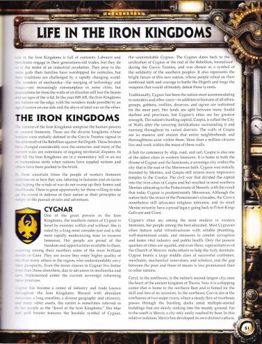 Drakkan Опубликовано 19 июля, 2016 Автор Жалоба Поделиться Опубликовано 19 июля, 2016 Жизнь в Железных Королевствах Жизнь в Железных Королевствах полна контрастов. Рабочие и купцы делают все по древним, проверенным веками, традициям, но также они не брезгуют и новинками промышленной революции. Они молятся богам, которым поклонялись их семьи на протяжении множества веков, но их традиции меняются вместе с быстро меняющимся миром. Чудеса техномагии - соединении техники и магии - все чаще встречаются в различных городах, но население вдали от стен цивилизации еще боятся чудовищ и дикарей, населяющих дикие земли. В 608 ПВ Железные Королевства представляют собой народы, живущие на грани. С одной стороны чудеса, которые становятся возможными в эту эпоху разума, с другой - пропасть всеобщей войны. Железные Королевства Народы Железных Королевств заключают в себе всю человеческую силу западного Имморена. Это разнообразные королевства, чьи границы были установлены Договорами Корвиса, подписанными после Восстания против орготов. Эти границы значительно изменились за прошедшие века, и многие из настоящих войн имеют в качестве причины именно территориальные споры. В 608 ПВ Железные Королевства переживают лишь кратковременное затишье в эпоху ужасной борьбы одного народа с другим, толкая весь мир на край пропасти. В эти неспокойные времена люди западного Имморена продолжают быть лучше, чем они есть, работая на фабриках и фермах. Они надеются, что ветры войны не уничтожат их дома и не оставят их без пропитания. Это величайшая возможность для тех, кто готов взять меч для защиты своего народа или своих принципов, и даже просто для того, чтобы заработать денег или жаждущих приключений. Сигнар Одна из могущественнейших сил в Железных Королевствах, южный народ Сигнара, окружен врагами как внутри, так и снаружи. Страна управляется очень рассудительным королем, что делает ее наиболее быстро промышленно развивающимся государством в западном Имморене. Народ Сигнара гордится свободой и возможностями, которые предоставляются им. Среди них живут самые одаренные и гениальные умы в Каене. Народ Сигнара наслаждается более высоким качеством жизни, чем многие другие люди остальных государств. Это благосостояние вызывает вполне понятную зависть окружающих народов. Даже беднейшие жители Сигнара живут лучше, чем где либо, благодаря техномагии, законам, и также проводимым государственным реформам трудовой деятельности. Сигнар является центром промышленности и торговли, известным среди всех Железных Королевств. Благословленные изобильными запасами ресурсов, продолжительной береговой линией, разнообразной географией и населением, а также множеством других ценных качеств, Сигнар получил от своих жителей прозвание "Жемчужина Железных Королевств". Синий с золотым флаг несет на себе геральдический символ Сигнара. Называется он Сигнус, и без сомнений известен во всех уголках мира. Сигнус датируется временами объединения Сигнара в конце Восстания, и официально утвержден Договорами Корвиса, став символом единства южных народов. Также он олицетворяет собой светлое будущее своему новому народу, чьи люди опираются на свою общую судьбу и мужество, проявленное в битвах с орготами. Это те люди, которые выковали оружие, что помогло свергнуть этих жестоких тиранов. Трад
