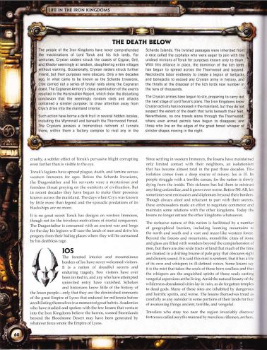 Drakkan Опубликовано 3 августа, 2016 Автор Жалоба Поделиться Опубликовано 3 августа, 2016 Легионы Торука распространяют чуму, смерть и голод по всему западному Имморену уже на протяжении веков. Перед Вторжениями Шарде, Дракон-Отец и его прислужники представлялись таинственной и бесформенной угрозой, терзающей окраины цивилизованного мира. Но за последние десятилетия они обозначили свое присутствие по всему материку. Дни, когда Крикс был известен лишь по легендам и единичным набегам их черных кораблей, остались в прошлом. Нет большого секрета, что Торук имеет планы на западный Имморен. Однако его не интересует обычное завоевание смертных. Дракон-Отец с давних времен ведет древнюю войну. Его легионы разрушают земли людей, изгоняя его потомков из их тайных убежищ, где они пытаются скрыться от его бессмертной ярости. Смерть из глубин Люди Железных Королевств никогда не понимали махинации Лорда Торука и его лич-лордов. Веками криксианские налетчики наносили удары по побережью Сигнара, Орда и Хадора абсолютно без всякой системы, неожиданно и без предупреждения. Изредка криксианские налетчики проникали вглубь материка, но их истинные цели оказывались покрыты мраком. Лишь несколько десятилетий назад, когда начались так называемые Вторжения Шарде, Крикс провел целую серию жестоких рейдов по всему сигнарскому побережью. Сигнарский Арсенал провел исследование, результаты которого были изложены в Докладе Хурстваллена. Этот документ убедительно доказал, что случайные набеги захватчиков и их атаки служат зловещей цели - отвлечь внимание от полномасштабного вторжения Крикса на материк. Все эти действия породили свои мрачные плоды в нескольких скрытых местах, включая горы Вирмволл и подземные пространства лесов Торнвуда. Криксианцы захватили гигантскую сеть тоннелей. Внутри этих тоннелей они разместили целый производственный комплекс, который вполне можно сравнить с тем, что располагается на островах Шарде. Закрученные тоннели были унаследованы от расы, называемой цефаликсами, которая с горячим желанием присоединилась к мертвым миньонам Торука, преследуя цели, известные только им самим. Заключив такой союз, область, контролируемая лич-лордами начала увеличиваться, захватывая все новые и новые территории Торнвуда и даже за его пределами. Некротехи работают без остановок, создавая легионы хэлджеков и боунджеков, превосходящих все прежние армии Крикса за все время ее существования, а число рабов, которые теперь принадлежат лич-лордам, исчисляется десятками тысяч. Сейчас криксианская армия начинает подозрительные движения, готовясь к выполнению следующего этапа планов Лорда Торука. Железные Королевства знают о том, что криксианская активность на материке в последнее время возросла. Однако они даже не подозревают о масштабах угрозы, что таится под самыми их ногами. Тем не менее, теперь ни один одинокий путешественник не может пересечь Торнвуд, где даже вооруженные патрули время от времени пропадают бесследно. Те же, кто живет на границе великих лесов, шепчутся о зловещих призраках, скользящих в ночи. Иос Внутренние области, поросшие густыми лесами и горы, окаймляющие границы государства Иос делают его крайне негостеприимным местом для посетителей. Народ Иоса хранит жуткие тайны и переживает страшную трагедию. Всего несколько ч